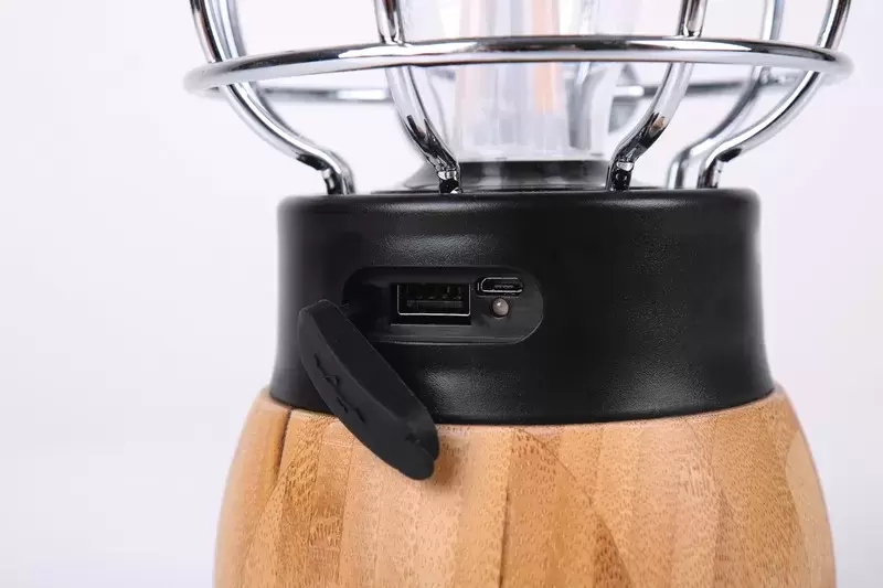 La lámpara LED regulable para camping. Con materiales de alta calidad, bambú y acero inoxidable. Se suministra con cable de carga USB y también se puede utilizar como power bank.