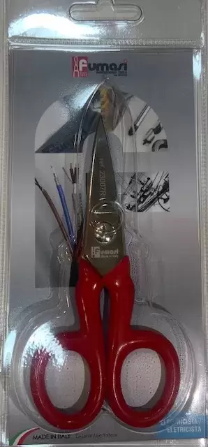 Tijera electricista Fumasi lama recta y mango metálico recubierto de plástico.