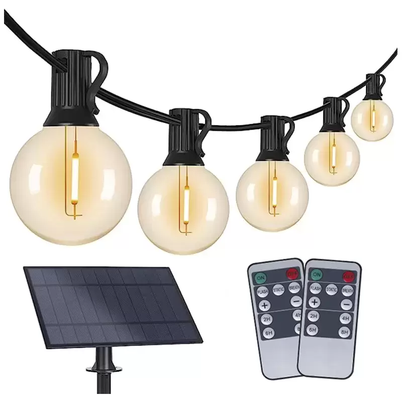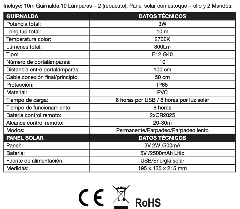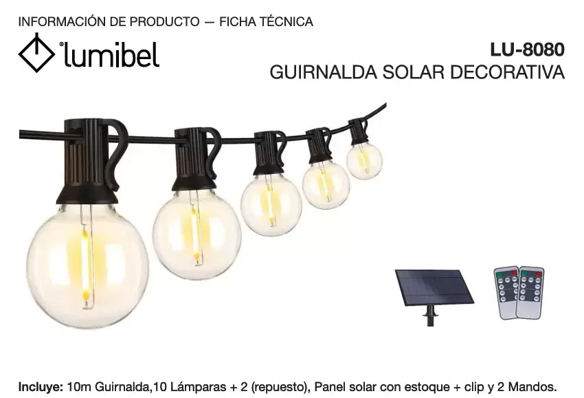 Incluye: 10m Guirnalda,10 Lámparas + 2 (repuesto), Panel solar con estoque + clip y 2 Mandos.