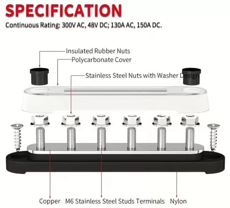 Cada barra colectora de 12v cuenta con 6 pernos de terminal M6 (1/4") y puede soportar un voltaje máximo de 300V CA y 48V CC, con calificaciones de amperaje continuo de hasta 130A CA y 150A CC.