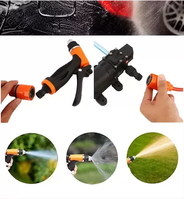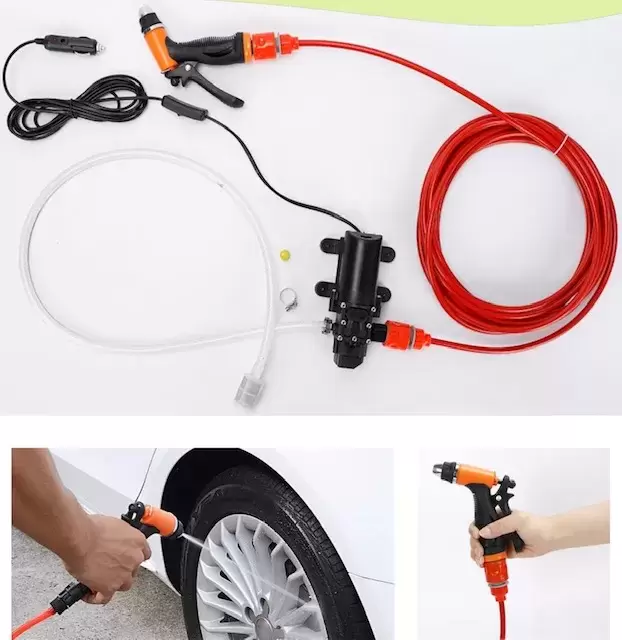 This kit connects to the car cigarette lighter and with a simple bottle or bucket it is fed with water and allows it to be injected under pressure with various types of output from a spray to a fine jet.