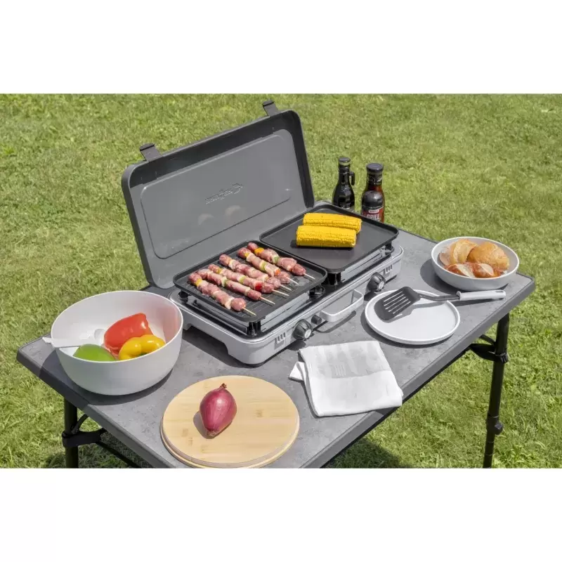 The Devil Kookmaster GP gas stove is a culinary essential that revolutionizes your outdoor cooking experience. Crafted with a sleek stainless steel cooking surface, this 2-burner stove combines functionality and style. Thanks to the piezo ignition, lighting the stove is simple and immediate. Designed with a convenient lid and handle for easy transport, this stove is perfect for outdoor adventures or as a reliable backup even at home. The Devil Kookmaster GP comes with both a smooth cooking plate and a ribbed cooking plate.