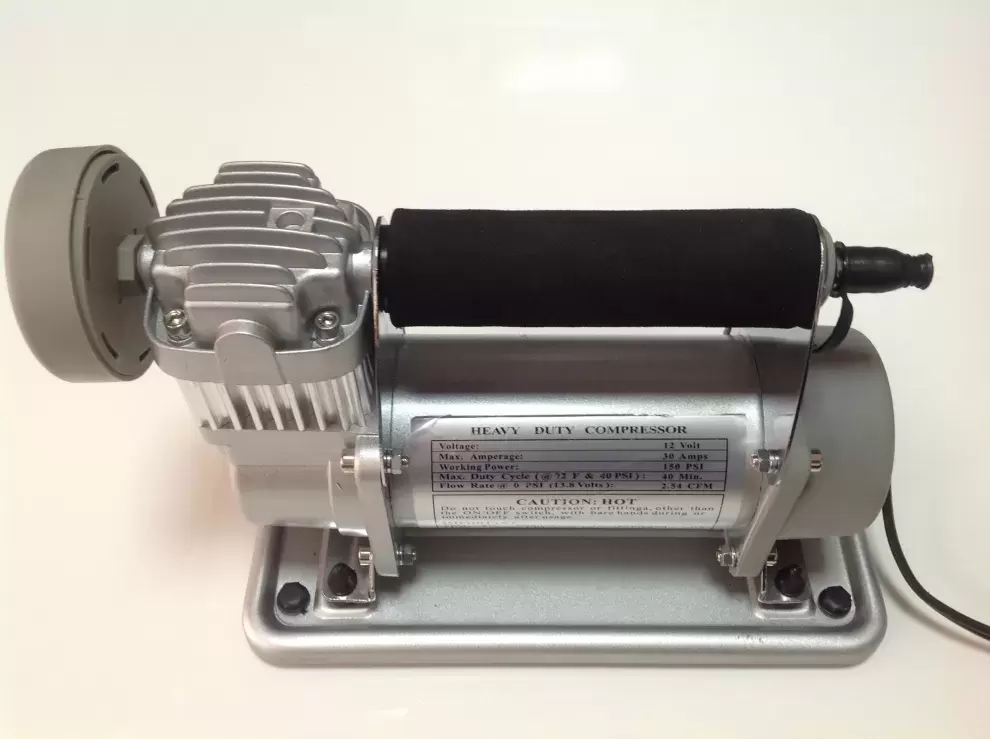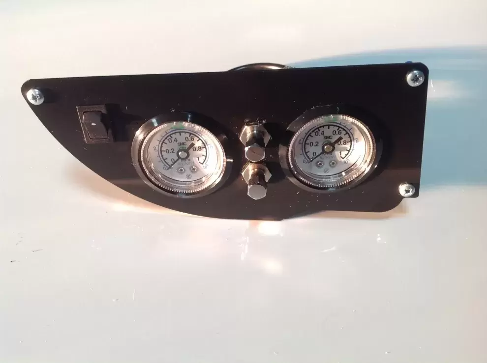 Control panel made up of a button to start the compressor and two analog pressure gauges to display each pressure. This system allows you to help level the motorhome or camper in a parking lot, having more pressure on one cylinder than on another. Once we continue our march, it is not necessary to deflate the other balloon and put pressure back on, its valve system levels both with the same pressure.