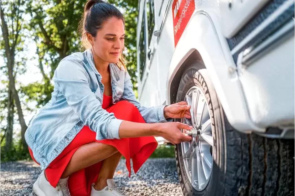 For initial installation, screw a special wheel bolt into a hole in the rim and adjust the distance with the included adjusting bolt. Then, simply slide the locking bar through the rim, insert the wheel clamp, and lock the cylinder lock: your caravan is well protected.