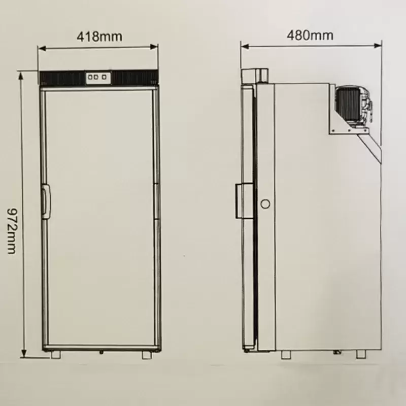 Depth dimensions including door (height x width x depth): 972 x 418 x 480 mm.