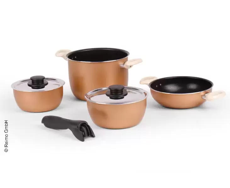 3 pots Ø 16, 18 + 22 cm, 1 frying pan, 2 lids, 1 gripping tongs.