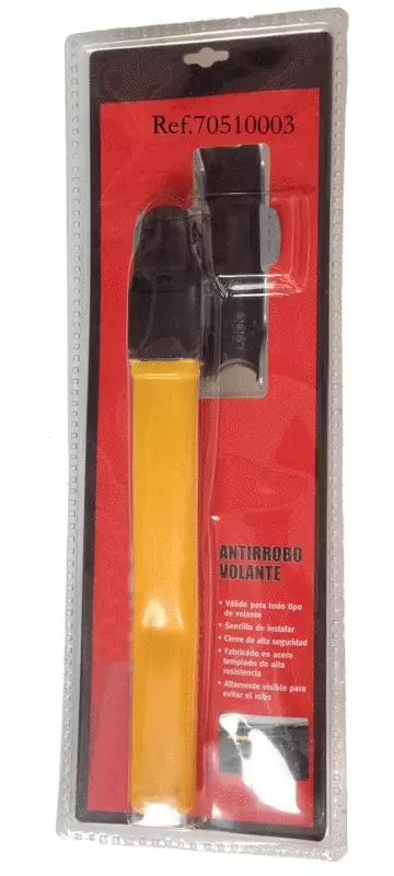 Easy to install steering wheel/dashboard lock, valid for all types of steering wheels, high security lock, made of highly resistant tempered steel, highly visible to prevent theft.