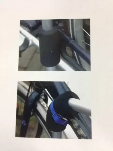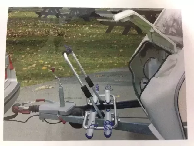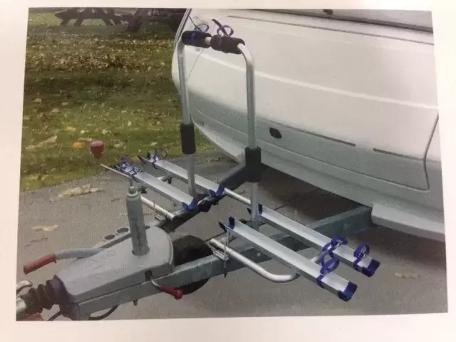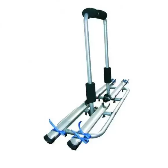 Universal bike rack for caravan trailer. Installation on the drawbar of the hitch without perforations or holes, simple and quick assembly. Adjustable aluminum rails with 3 fixing straps per bike + safety strap for optimal and secure support.
