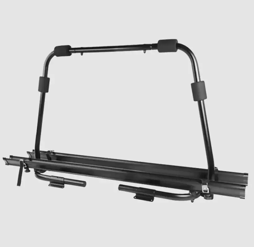 Black bicycle rack for tilting 2-bike caravan trailer.