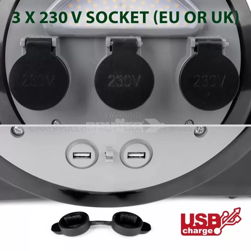 The 3 Schuko sockets and 2 USB ports allow you to easily connect all electrical and electronic devices. With a reinforced plastic body, lightweight and weather resistant.