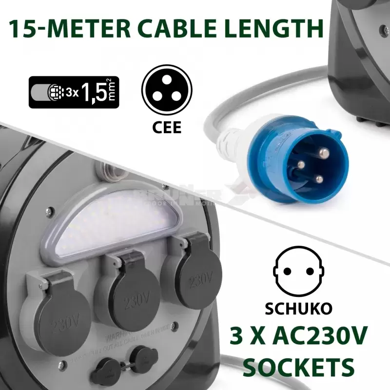 The CEE cable reel with integrated lamp is your perfect ally for outdoor activities.