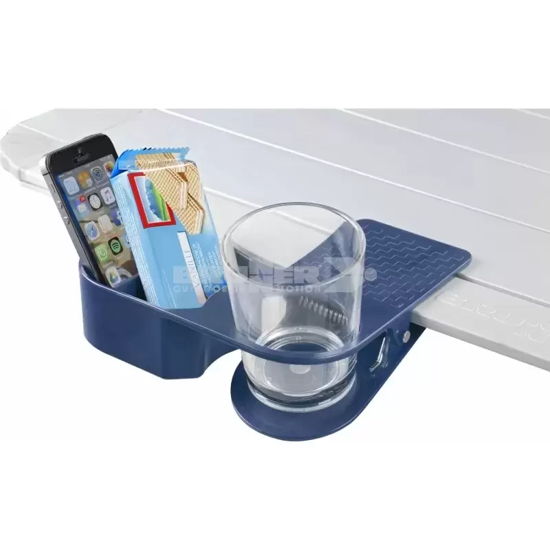 It is attached to the table on the side and ensures a secure hold for glasses, cans or other small accessories.