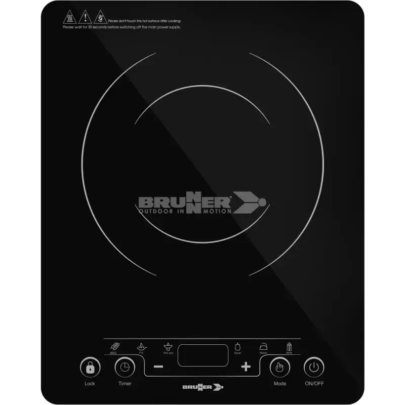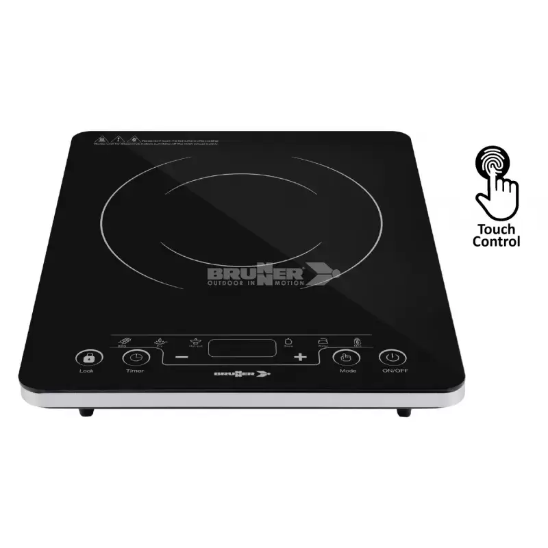 Portable induction cooktop with a PP body and heavy-duty glass ceramic cooking surface. Perfect for outdoor and camping use thanks to its low weight and 9 power levels (300-2000 W) selectable via the Touch Control switch and LED display. With a powerful fan and ventilation holes.