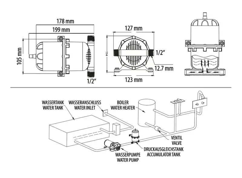 Motorhome expander bottle for pumps with pressure switch, prevents water shocks that the pump can produce, improving its performance.