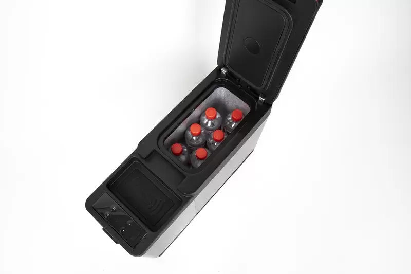 The multifunctional center console with integrated 12V/24V compressor refrigerator comes with a separate mounting plate, allowing for quick and easy attachment to the vehicle. The lid of the refrigerator compartment is covered with imitation leather, decorative stitching provides an elegant look.