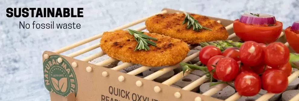 The donut-shaped briquette design optimizes thermal performance in combination with lava stones. This results in up to 50% less charcoal usage and better performance compared to the well-known disposable aluminum grill.