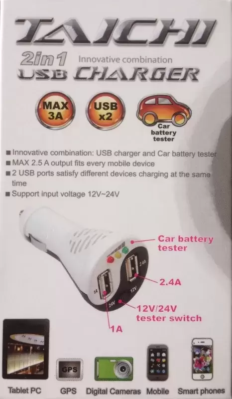 Connector for TITAN brand cigarette lighter with two USB outputs and battery charge test, suitable for 12 or 24 volts, maximum charge capacity 3 ah.