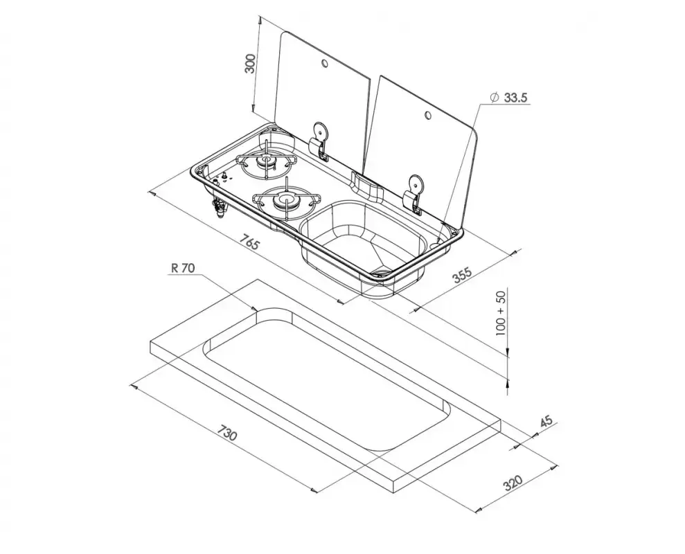 Cooker 2 burners and sink Can FL1465-P for caravans, motorhomes and camper.