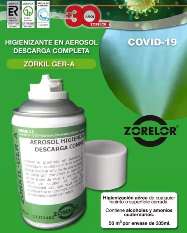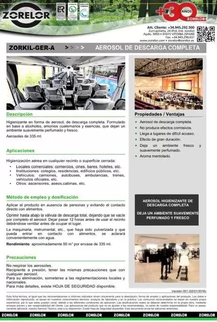 Method of use and dosage Precautions Properties / Advantages Version 001 (01/02/2016) ZORKIL-GER-A FULL DISCHARGE AEROSOL Air sanitization in any enclosure or closed surface: