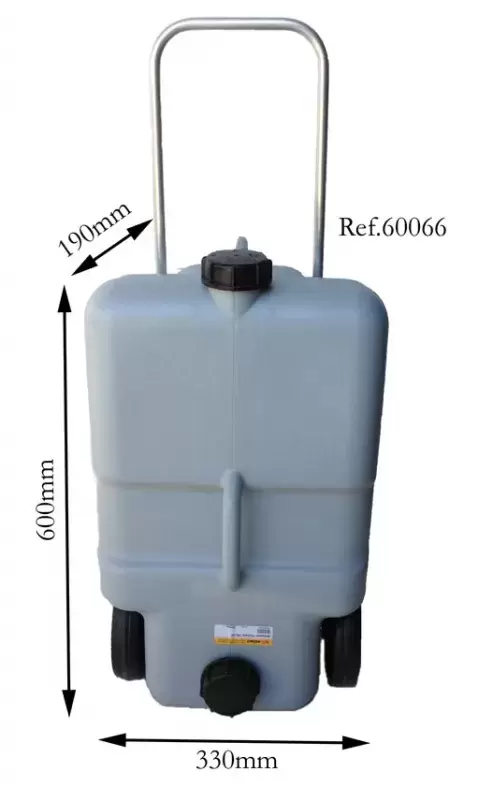 Practical 24L capacity water tank with wheels with a retractable aluminum handle for comfortable transport and two plastic handles for easy emptying.