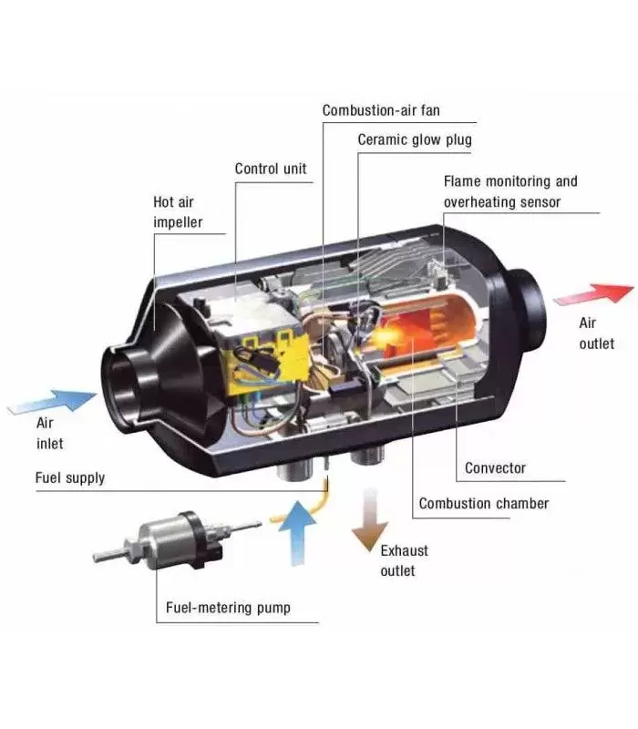 Includes universal mounting kit, sword for connection to the diesel tank, digital display programmer, adjustable air outlet nozzle, 60mm tube.