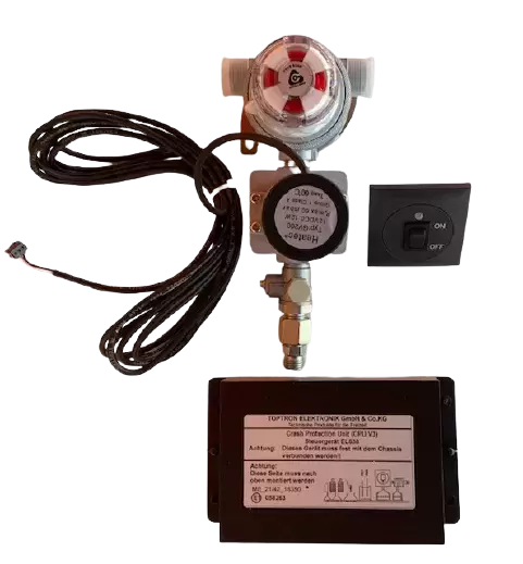 The patented Crash Protection Unit - CPU immediately cuts off the gas supply in the event of an accident and thus enables the refrigerator, heating and boiler and other gas consumers to run on gas while driving, e.g. including special regulations for Spain, France and other countries.