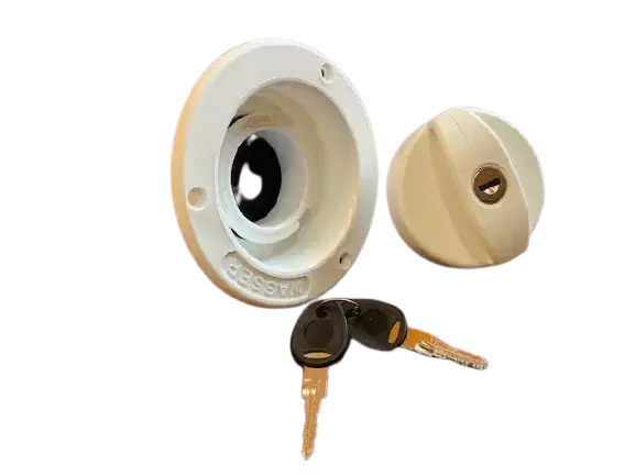 Exterior water intake with white plug for caravans, motorhomes and camper.