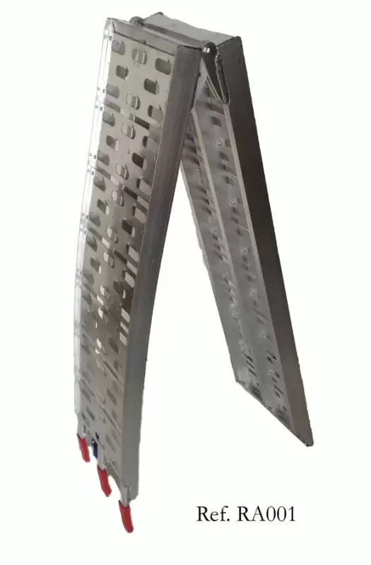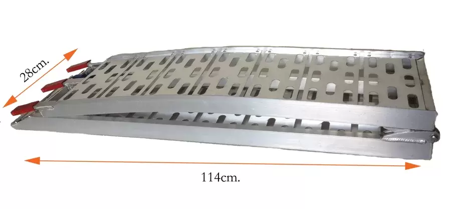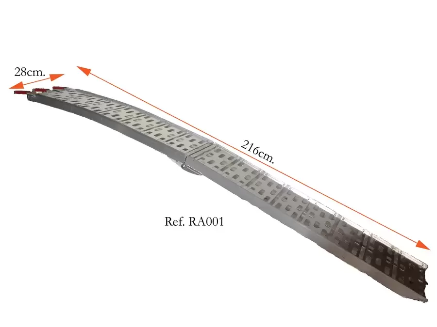 Folding aluminum ramp with a curved shape to facilitate loading, with a capacity to support 340 kg.