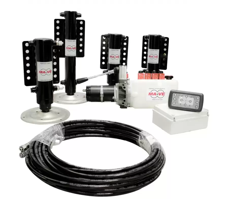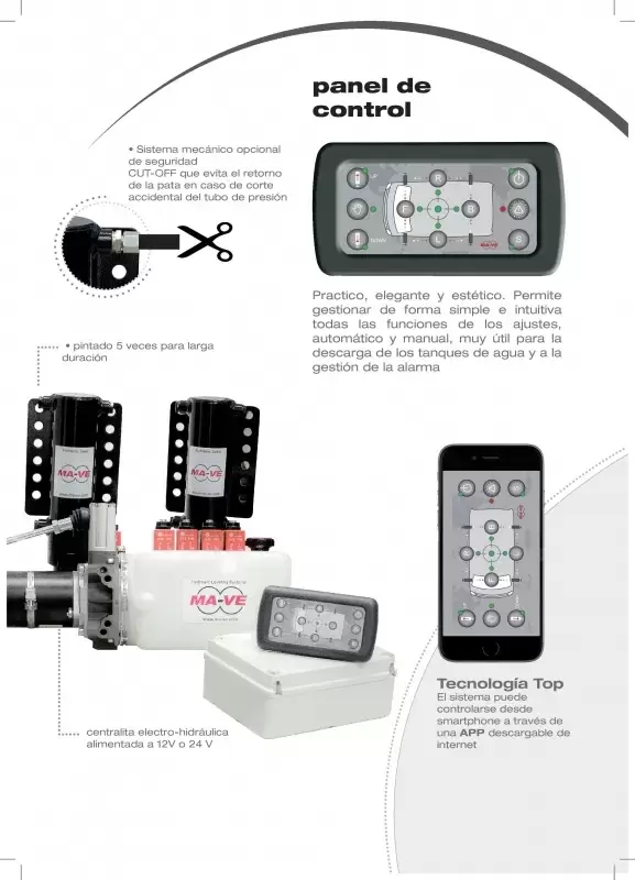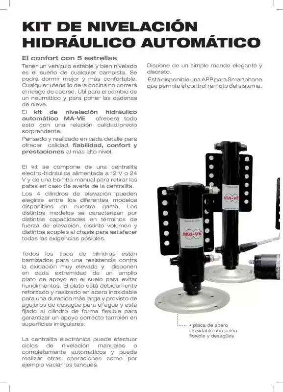 Conceived and carried out with care in every detail to give quality, reliability, comfort and performance at the top of the category, consisting of an electro-hydraulic control unit powered at 12V or 24V and a hand pump that guarantee Also remove the legs in case of power failure.