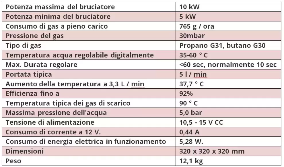 Power absorbed by the burner (propane/butane): 10 kW • The boiler starts and stops automatically, detecting the flow of water.