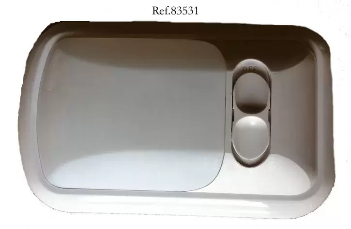 Interior light with white housing, built-in switch.