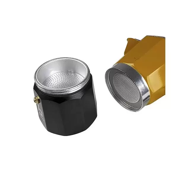 Beautiful aluminum coffee maker with a combination of chocolate and mustard yellow colors.