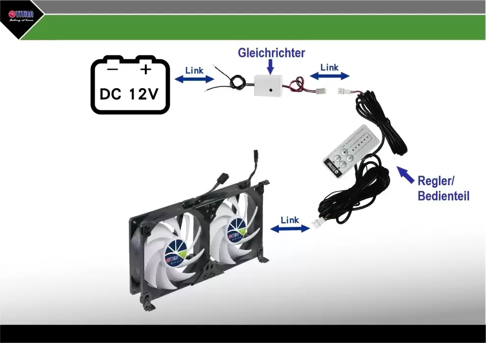 You should first connect the double fan BEFORE INSTALLATION and test if the fans rotate and also to note in which direction the airflow is blown or air is sucked in.