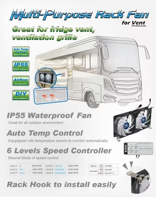 You can use this double fan in your mobile home, caravan, camper van or truck.  Ideal as a fridge fan or for ventilation in home cinemas, audio/video cabinets, home servers, network cooling and much more.