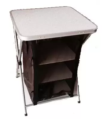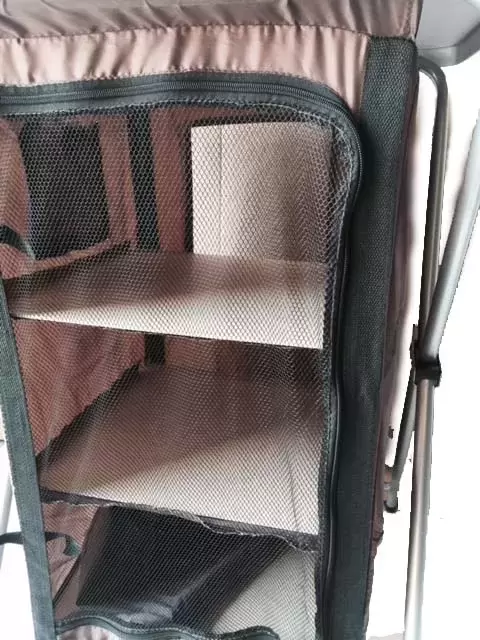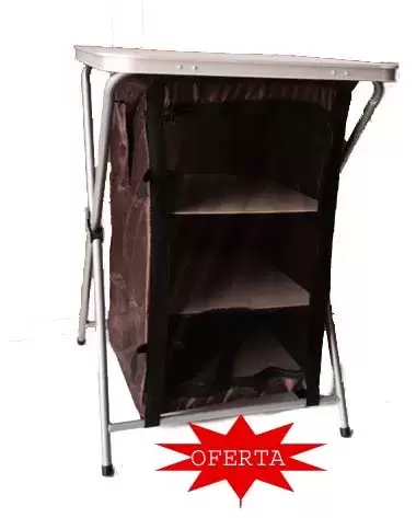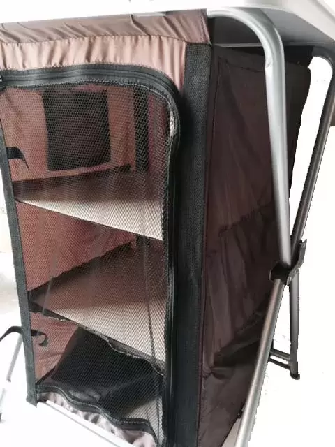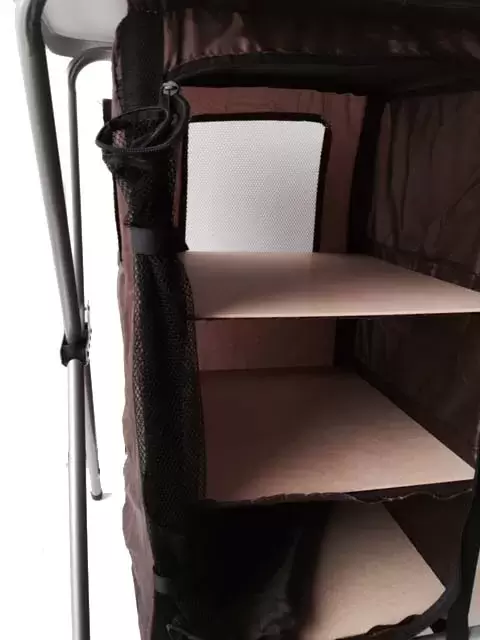 Economic kitchen cabinet with three shelves, rear roll-up mosquito door also mosquito net, side pockets, metal structure and table with aluminum frame.