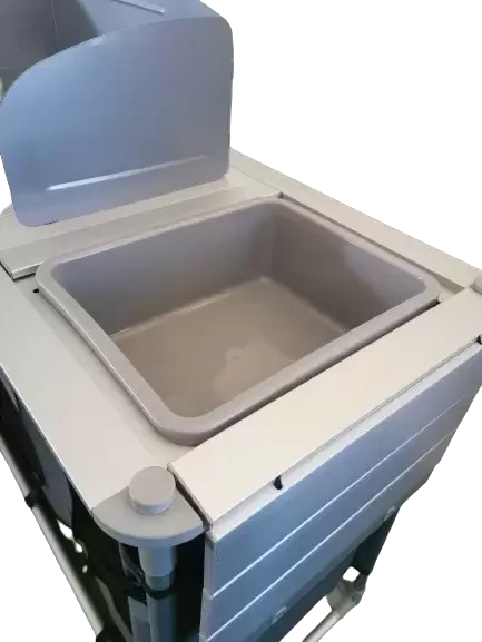 Aluminum connecting bars and plastic corner profiles, adjustable legs, shelves with aluminum edge, special space for the gas cylinder.