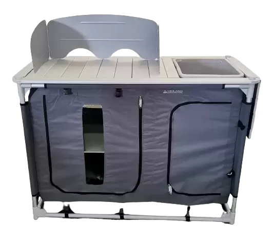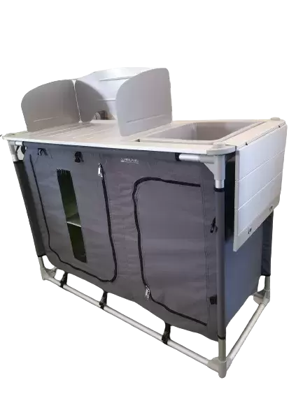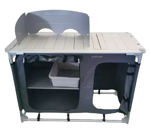 Kitchen table with built-in sink and windbreak screen multiple applications