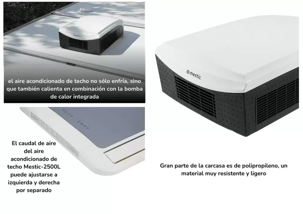 Main advantages: Cools, heats, and ventilates Polypropylene housing ensures less weight Adjustable airflow: adjust the volume left and right Do you want to keep your vehicle cool while you sleep, without the cold air flow directed towards you? It's possible! The airflow of the Mestic RTA-2500L roof air conditioner can be adjusted separately to the left and right. You can also choose to use the ventilation setting only at night. Thanks to the practical timer function, you decide how long you want the air conditioner to be on.