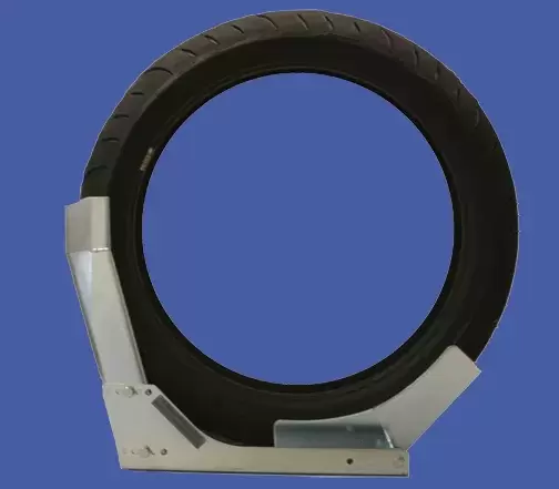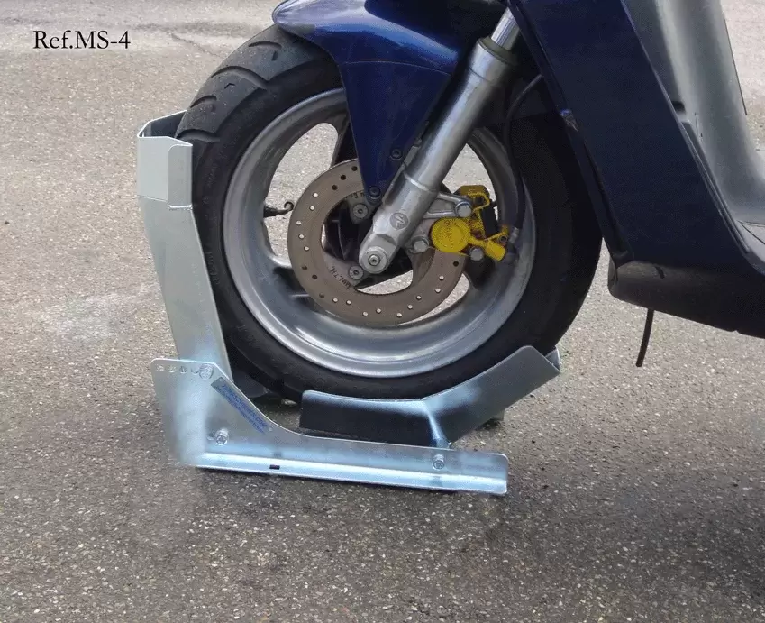 Ideal support for mounting inside the garage or trailer, with a rocker system that catches the wheel in a single movement, keeping the motorcycle fastened in a vertical position, being able to release it to comfortably place the fastening straps.