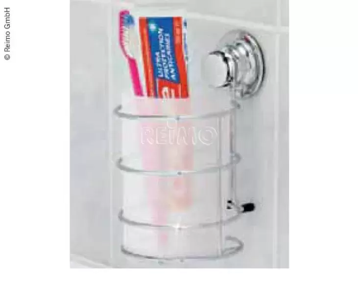 Multi-use bathroom cup with suction cup for caravans, motorhomes and campers.