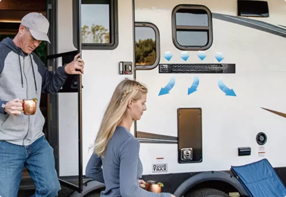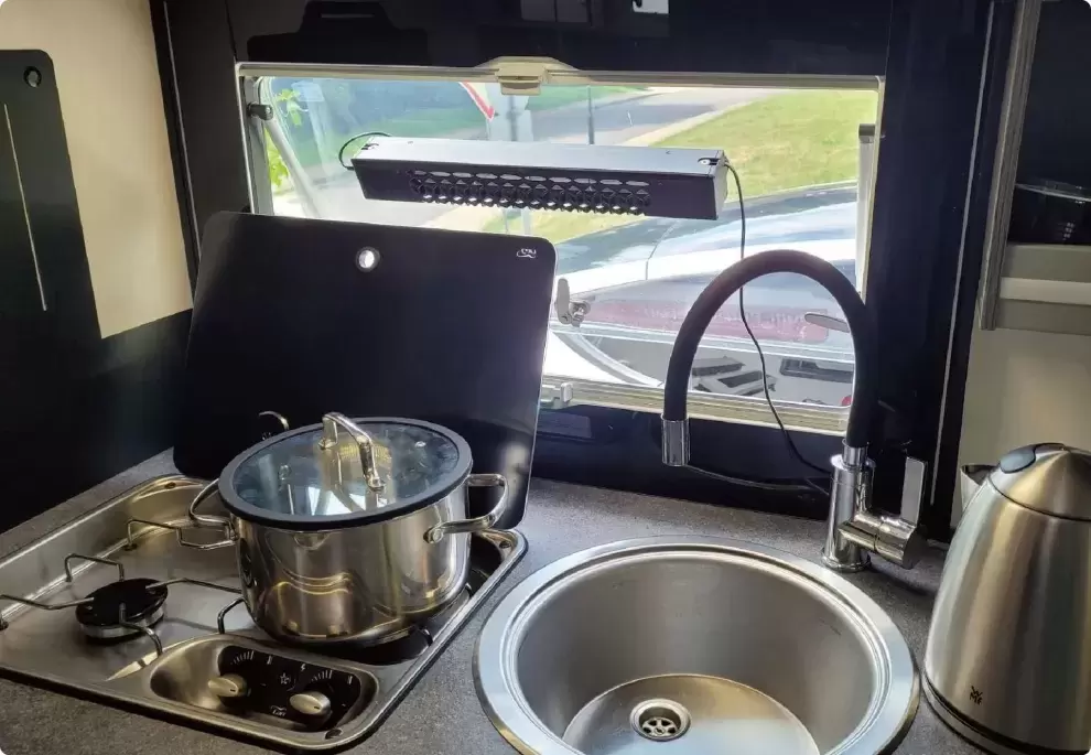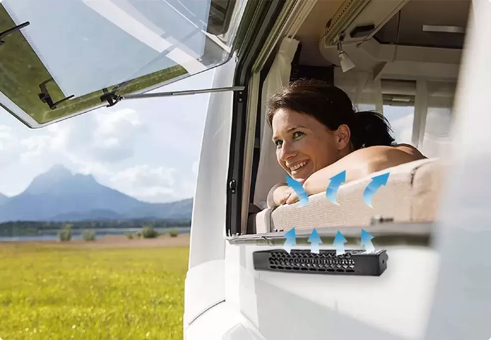 Multifunctional outdoor fan, kitchen extractor and anti-fogged windows fan for caravan, motorhome and camper.