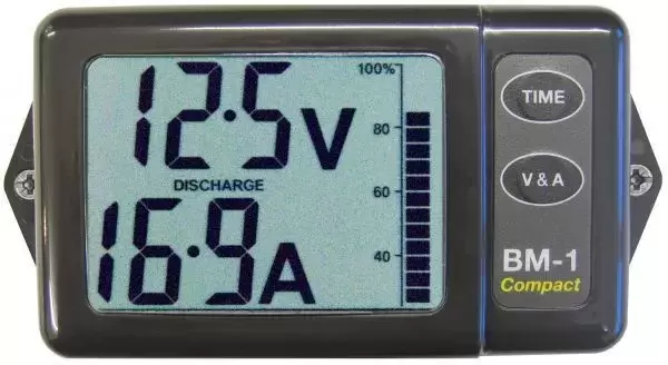 4 keys to select backlight, displays volts/amps/state of charge, amp hours, and runtime remaining