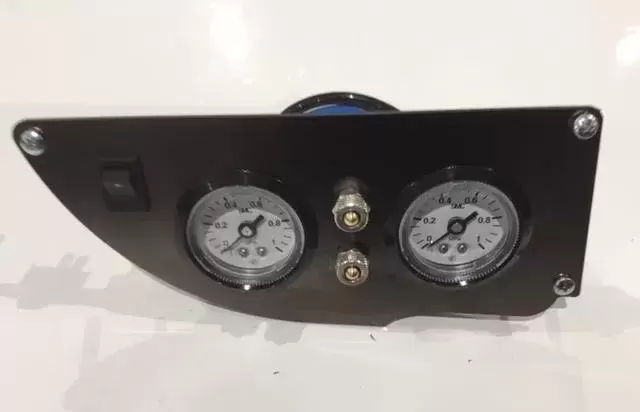 Control panel consisting of a button to start the compressor, two pressure gauges to display each pressure, this system allows you to help level the motorhome or camper in a parking lot, having more pressure in one cylinder than in another, once we continue our march It is not necessary to deflate the other balloon and put pressure again, its valve system levels both with the same pressure.