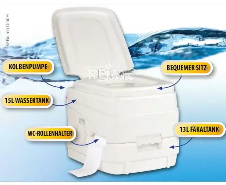 Perfect hygiene.. Easy to use, portable chemical toilets of the highest quality. Compact size to keep technically sophisticated and easy to clean. It is made up of two parts, from the upper part with the seat, the lid and the fresh water tank (15 litres) and the lower part with the waste water tank (10 litres) and closing device. upper and lower parts are connected by a plastic clasp. The bottom part is provided with a robust handle and can be closed hermetically, thus transporting and disposing of waste water in a convenient way. Antibacterial toilet seat prevents the formation of fungus and bacteria, solid and practical hand pump with a large flush volume of 15 liters of water is enough for about 125 flushes vent valve , All components made of high-quality plastic design Very robust, hermetically sealed base for convenient transport to the emptying location.