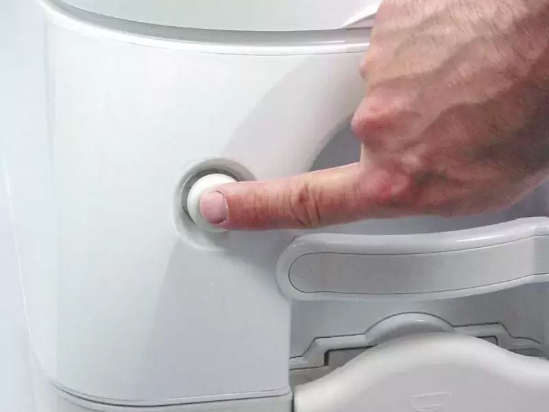 Portable toilet for camping 972 Dometic. by simple push-button operation, increased pumping efficiency by strong pressure flushing, up to 27 flushes with one fill, splash-free emptying, overfill protection on smaller volume of fresh water / 8.7l and waste water volume larger 9.8L and is made of ABS and nice glossy finish.