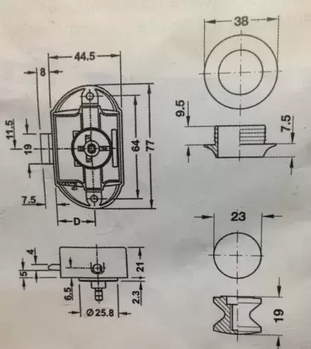 Push-button clasp with rosette and mechanism in gray white, measurements in attached photo.