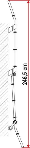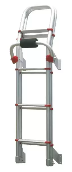 Folding aluminum ladder for the rear of a caravan or motorhome to access the roof of the vehicle with a rubberized support for a drop-down area