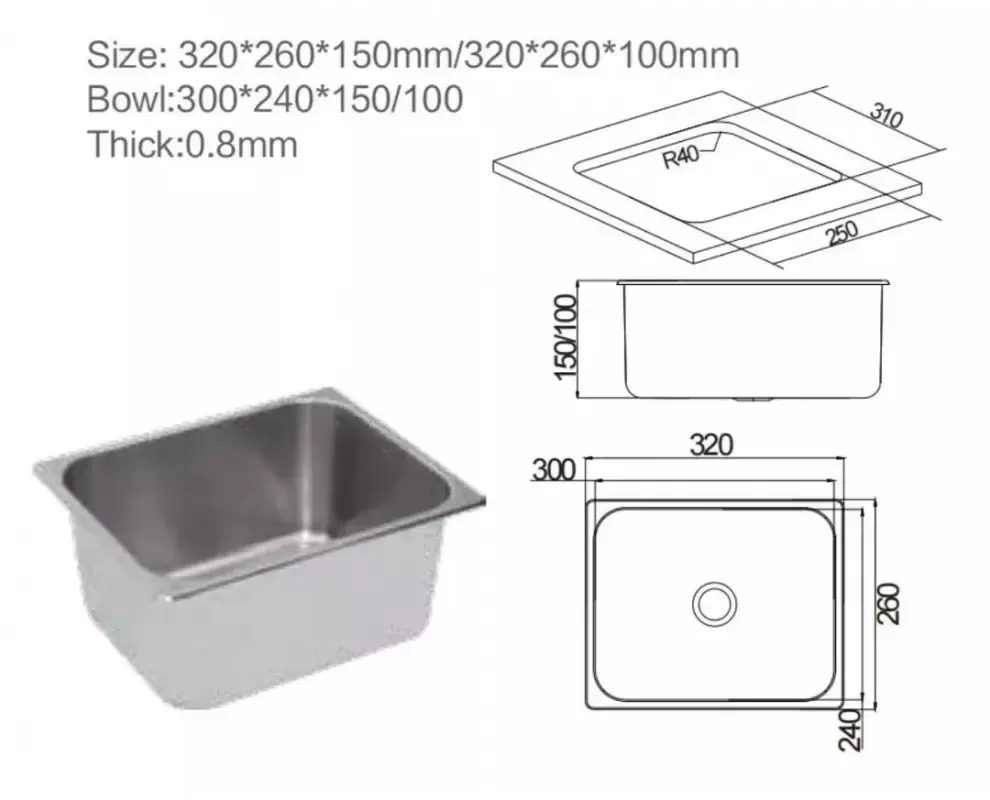 Rectangular stainless steel sink 320x260 for caravans, motorhomes and campers.