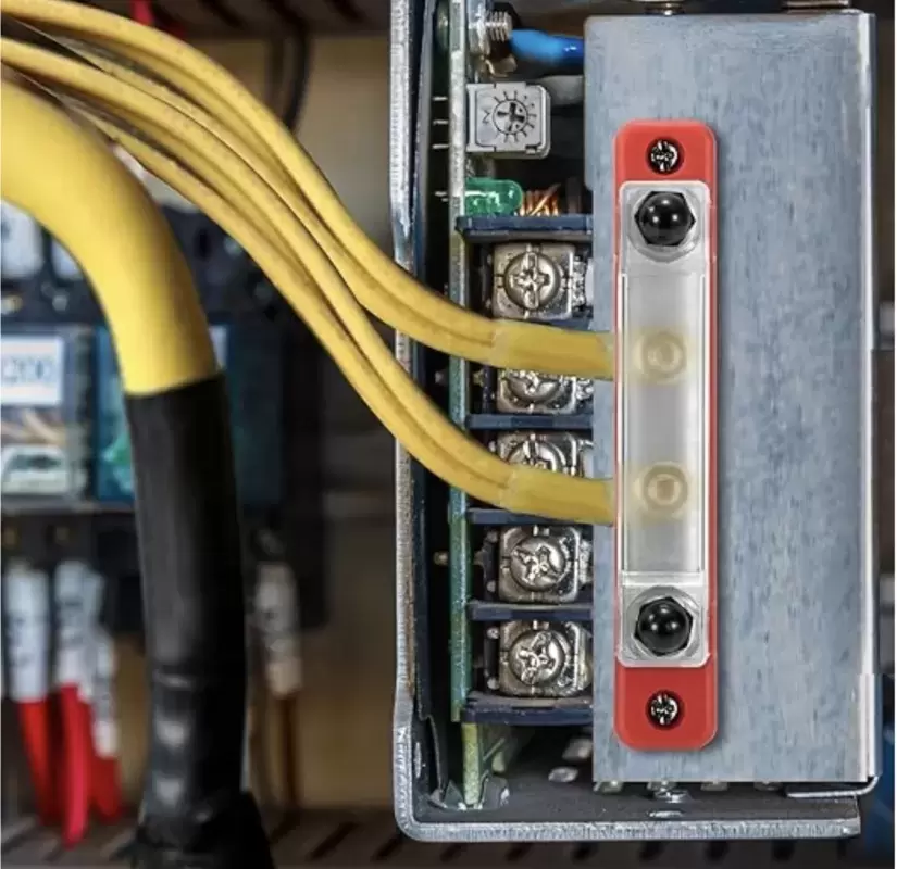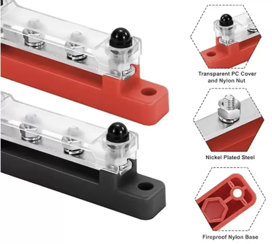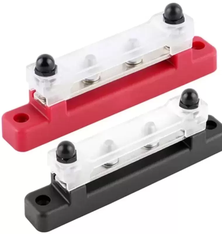 RED Busbar 150AH POSITIVE 4-connection bar plus cover for installations in motorhomes and campers.