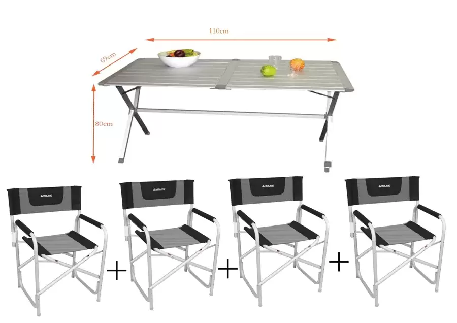 Set of removable aluminum table (very compact once disassembled and folded) plus four director's chairs with aluminum structure.